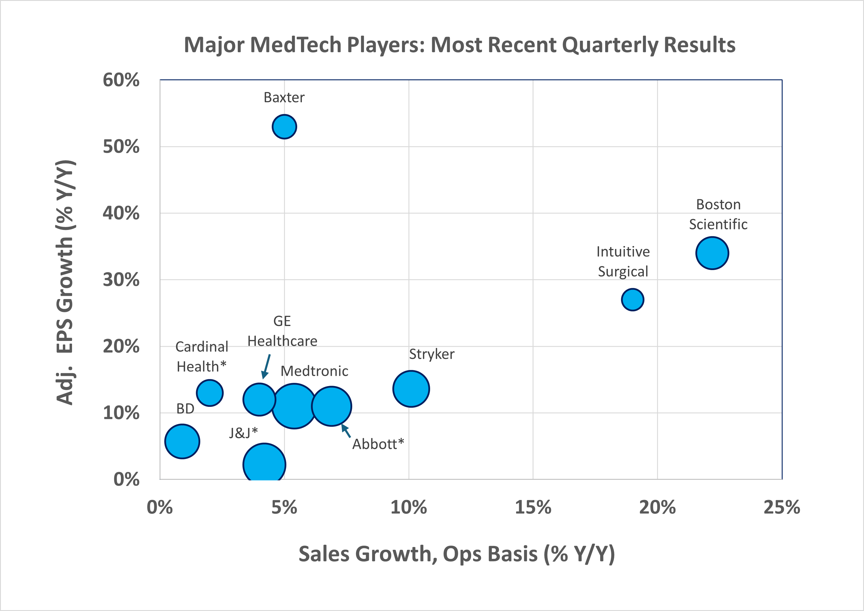 As shown in Figure 1, most of the leading MedTech companies reported operational sales growth in low-single digits, and earnings growth in high-single, or low double- digits during the most recent quarter. Stryker, Intuitive Surgical and Boston Scientific were the three breakaway companies with both sales and earnings growing double digits compared to the same quarter in prior year.